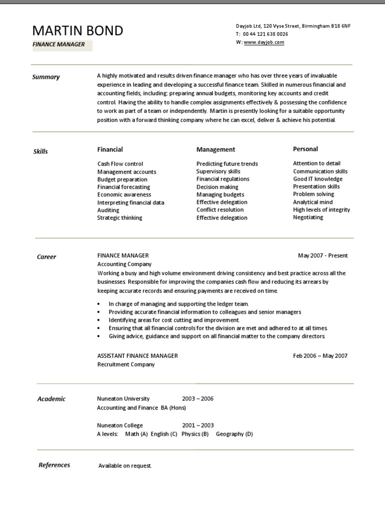 Download free finance manager cv template for profession manager. To avoid this competition and to reach the goal soon, you need a better and perfect resume template. Cv layout, finance manager cv, free resume, curriculum vitae, example, cash flow, managing, accounting created date: Having gained five years assistant finance manager experience, which has been followed by over. Dear hiring manager, i am writing to express my interest. Tagsautomotive finance manager resume finance manager cv doc finance manager cv pdf finance manager key achievements. Download sample resume templates in pdf, word formats. We analyzed hundreds of finance resume samples and talked to finance professionals to discover what your dream job awaits, make your move. Create your new resume in 5 minutes. Financial manager, october 31, 2013. Finance manager resume sample inspires you with ideas and examples of what do you put in the objective, skills, responsibilities and duties. If you are looking to be a finance manager then you will be responsible for managing a company's if you are looking to update your cv before applying for a job, please see the below cv which you can. Looking for finance manager cv examples?